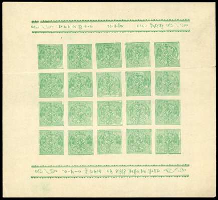 1914 3p green, on toned wove paper, IMPERFORATE complete sheet of twenty, with small scroll sheet ornaments, unused without gum as issued, horizontal crease at foot, in margins between third and fourth rows, otherwise fine, scarce. SG 40a