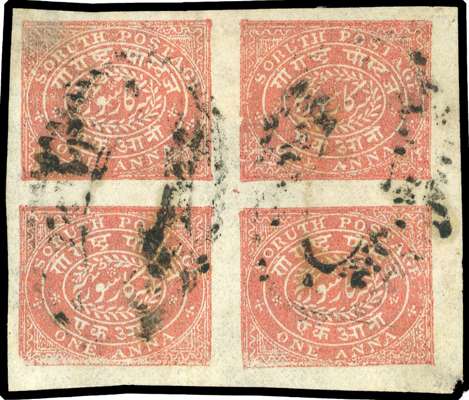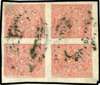 1914 1a rose on white wove, IMPERFORATE BLOCK OF FOUR, USED, cancelled by strikes from native oval postmark, small patch of oxidisation at top left and shallow patch of thinning to lower right, otherwise fine, rare, listed but not priced in used condition in Part I. SG 41da