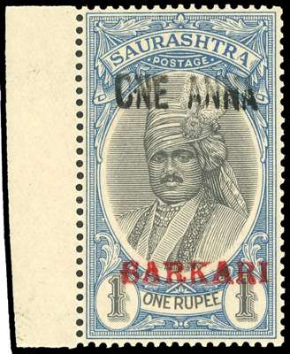 OFFICIAL: 1948 ‘ONE ANNA’ on 1r black & pale blue, h/s surcharge, type O2 seriffed ‘SARKARI’, left marginal, unmounted o.g. central horizontal crease, still fine and rare for this key KGVI stamp. SG O19 £1700