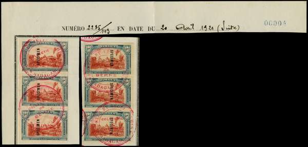 1921 'Abolition of Slavery' 6d red and dull blue-green, both of the unissued stamps with MCA and Script watermarks, opt 'SPECIMEN' for UPU distribution, each as a vertical strip of 3 (the former severed between the first and second stamps), neatly affixed to individual pieces from the Madagascar P.O. archive and tied by two strikes of the red 'POSTES ET TELEGRAPHES / COLLECTION DE BERNE / MADAGASCAR' large circular receiving H/S. The first (larger) piece from the top of a ledger page headed 'NUMERO 2235/143 EN DATE DU 20 Avril 1921 (Suite)' with page number '00004' in blue. A unique and wonderful pair of this famous stamp, prepared for use but unissued for political reasons, and in exceptional condition. SG 90s-91s