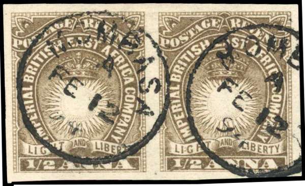 1890-95 ½a dull brown imperforate horizontal pair, used, cancelled by fine strikes from Mombasa cds for FE 12 94, fine and scarce. Only two sheets (=60 pairs) existed. SG 4a £700