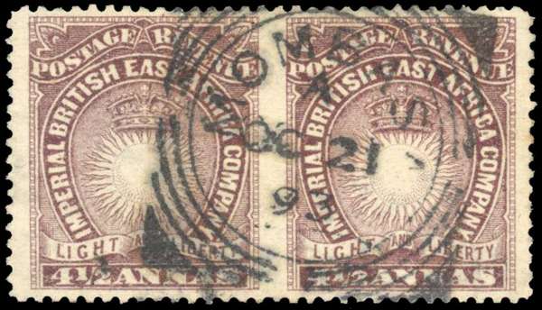1890-95 4½a brown-purple imperforate between horizontal pair, used by part strike of Mombasa squared circle for OC 21 93, fine and rare. Only 30 pairs existed. David Brandon Certificate (1999) SG 11ac £1000