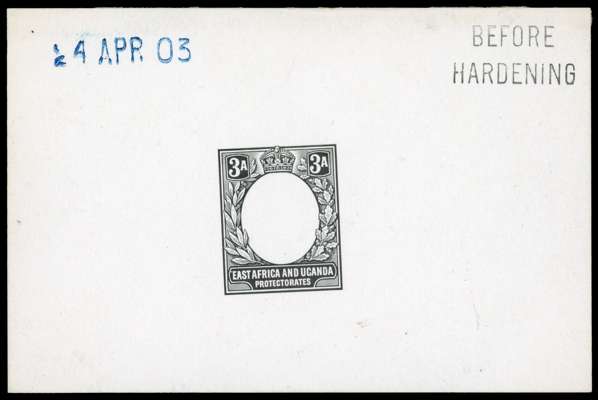 1903 3a De La Rue die proof in black on glazed card dated “24 APR 03" in blue and endorsed “BEFORE HARDENING”