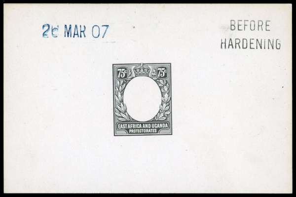 1907 75c De La Rue die proof dated “26 MAR 07” in blue and endorsed “BEFORE HARDENING” in black. Fine.