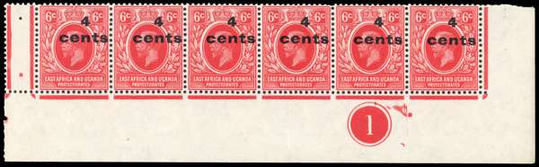 1919 4c on 6c scarlet, type 5 surcharge, lower marginal horizontal strip of six, from foot of the sheet with plate number ‘1’ all showing variety BARS OMITTED, as a result of upwards misplacement, unmounted o.g. very fine and scarce positional multiple. SG 64c £300++
