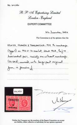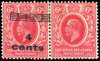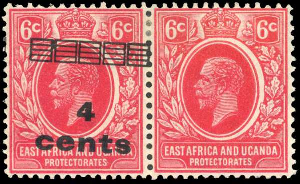 1919 4c on 6c scarlet, surcharge type 5, pair showing variety PAIR ONE WITHOUT SURCHARGE, large part o.g. BPA Certificate (2004) SG 64d £2000