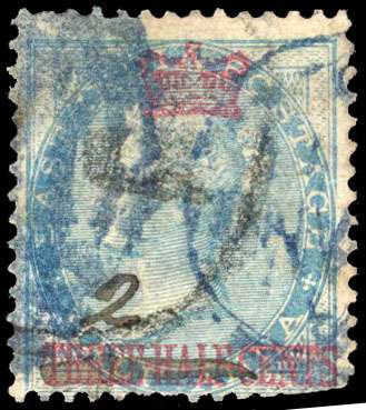 1869 ‘2’ surcharge in manuscript and ‘THREE HALF’ deleted in black on ½a blue, cancelled in blue and black, soiled, thinned and clipped at lower left. A collectable example of this scarce surcharge. SG 10