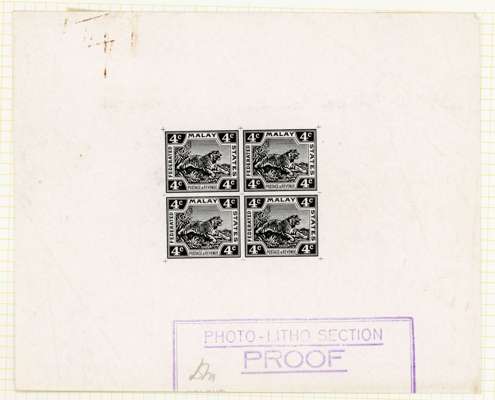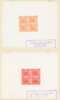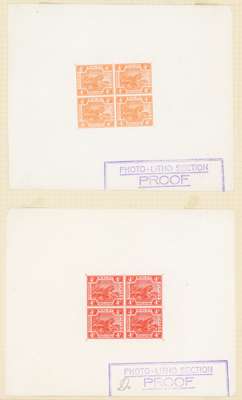 1933-34 Survey Department 4c Leaping Tiger essays on thin glazed paper (Norris Type A), similar design to issued, printed in blocks of four in orange, red and black (slight foxing caused by a metal paperclip), each showing guide crosses in all four corners and ‘PHOTO-LITHO SECTION/PROOF’ boxed handstamp in purple. Fine