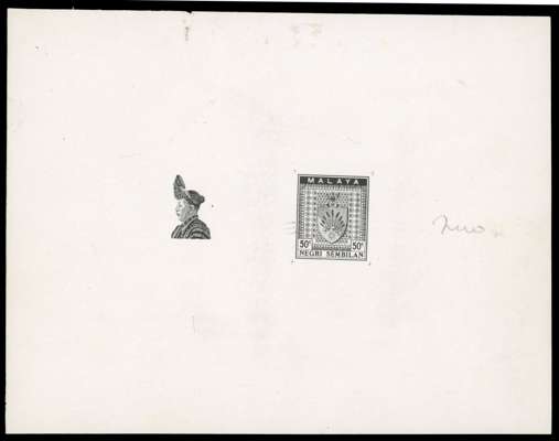 1933-34 Survey Department essay in black on glazed paper, horizontal pair (193x114mm) comprising Pahang Sultan Sir Abu Bakar unframed vignette (similar to Norris types F and O) and Negri Sembilan 50c Coat-of-Arms with closed sheaves of rice (similar to Norris type I). Slight imperfections at top otherwise fine