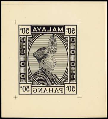 1933-34 Survey Department essay in black on wove paper, 50c Sultan Sir Abu Bakar, enlarged and reversed (212x193mm) with horizontal background shading. Minor imperfections otherwise fine. Unrecorded in Norris