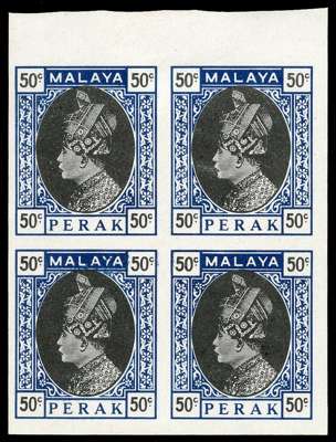 1933-34 Survey Department 50c Sultan Iskandar essays on glazed paper with solid background blocks of four