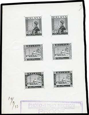 1933-34 Survey Department essays in black on glazed paper, vertical block of six (113x131mm) comprising two of each of smaller designs of 50c Sultan Suleiman (Norris S26), 50c Mosque (Norris M37, 39); ‘PHOTO-LITHO SECTION/PROOF’ boxed purple handstamp, manuscript ‘2’ and '19/9/33'. Fine
