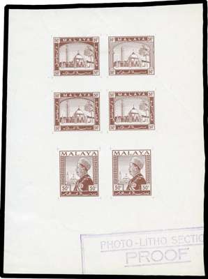 1933-34 Survey Department essays in brown on glazed paper, vertical block of six (100x133mm) comprising two of each of smaller designs of 50c Mosque (Norris M37, 39) and 50c Sultan Suleiman (Norris S28); ‘PHOTO-LITHO SECTION/PROOF’ boxed purple handstamp. Fine