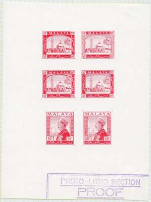 1933-34 Survey Department essays in red on glazed paper, vertical block of six (103x137mm) comprising two of each of smaller designs of 50c Mosque (Norris M37, 39) and 50c Sultan Suleiman (Norris S28); ‘PHOTO-LITHO SECTION/PROOF’ boxed purple handstamp at foot. Fine