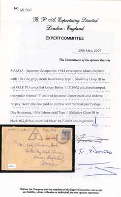 1942 (11 JY) censored cover from Johore Bahru to Muar, franked by 1942 8c grey (chop "H" = SG 151), tied by despatch cds with red Japanese censor mark alongside. Assessed as underpaid with m/s endorsement "Containing 2 Letters. To pay 16cts" and "T" in triangle tax mark on face, the deficiency paid (on reverse) by 1942 Johore 8c orange postage due (chop "H" in black) vertical pair, tied by Muar cds, dated "14 JY 2602". Opened on three sides for display, and faintly toned, still a fine and rare usage. BPA cert (2007), SG JD3a, £3,000