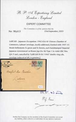 1942 (Oct 8) locally addressed envelope from the 'Chinese Chamber of Commerce', franked with 1937-41 Straits Settlements 3c green and 5c brown, each handstamped with ‘Dai-Nippon Teikoku Seifu' (Imperial Japanese Government) chop in violet (as Brunei Jap Occ ‘Type 1’ in SG part 1) , tied by 'Labuan/8 OC/1942 double ring cds. Cover reduced during opening at left edge and with small mark next to stamps, still a fine and extremely rare franking. BPA cert (2023)