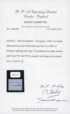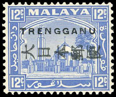 1944 (1 Oct) Selangor 12c bright ultramarine (Kanji left to right) with type TT1 "TRENGGANU" opt, fine large part o.g. Very scarce in unused condition. BPA cert (2024) S.G. TT15 cat £425