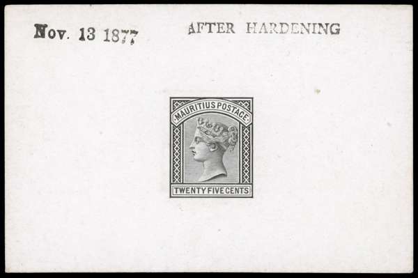 1877 25c die proof in black on glazed card, dated “Nov. 13 1877” and endorsed “BEFORE HARDENING” in black. Fine.
