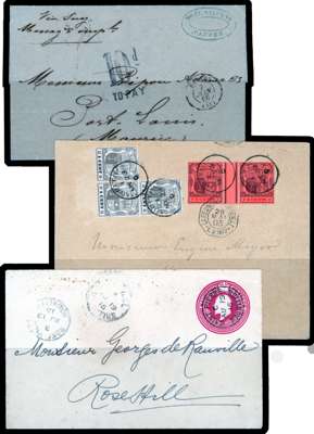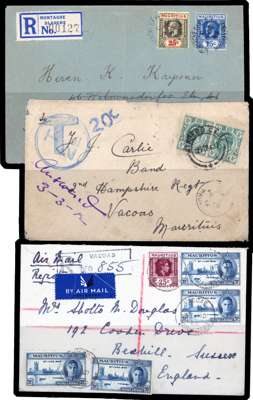 1860s to 1950s postal history collection, including 1866 incoming entire letter to Port Louis from France with Nates & jun 66 cds and 10d to pay h/s, 1903 cover to Switzerland franked by 1c in block of 3 and 6c interpane pair, bearing 'La Reunion A Marseille L.V NO2 octagonal French Ship d/s, 1912 incoming cover from Transvaal and taxed at 20c, 1915 KEVII 6c postal stationery envelope tied by scarce Saint Pierre cds for AU 19, 1932 registered cover to Germany and re-addressed, and 1950 commercial cover to Bangkok franked by 12c tied by Port Louis machine cancel for 24 NOV, taxed on arrival with relevant h/s, generally fair to fine condition. (7)