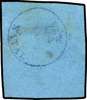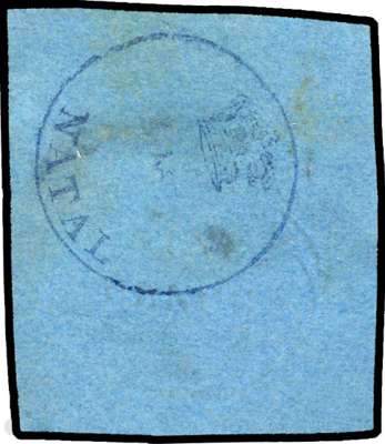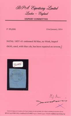 1857-61 embossed 9d blue, imperf with good to large margins (30 x 34mm), neatly cancelled by blue crown cds of Durban, rather flat embossing and repaired on reverse, nevertheless a collectable example of this very rare stamp. BPA cert (2024). SG 6, cat £9500