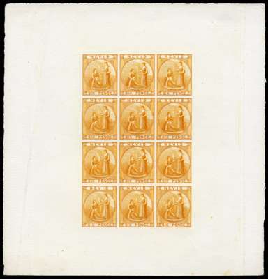 1862 greyish paper issue. 6d Colour Proof sheet of twelve in orange on card, rich colour, fine. Ex Freeland. SG 3