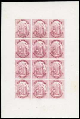 1862 greyish paper issue. 1s Colour Proof sheet of twelve in pale lake on card, margins reduced on all four sides; fine with attractive, delicate colour. Ex Freeland. SG 4
