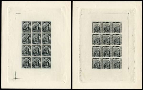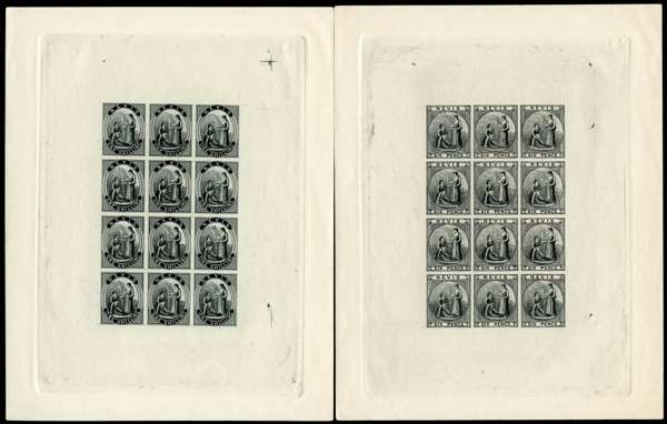 1862 greyish paper reprinted sheets of twelve in black, the 4d from the defaced plate, fine unused. Ex Freeland. SG 1-4