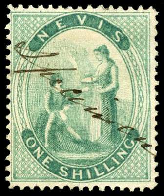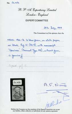 1867-76 white paper 1/- blue-green with manuscript “Specimen”, unused without gum, fine. BPA Certificate (1999). Ex De La Rue Archives, Borromeo and Freeland. SG 13