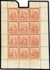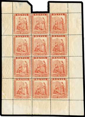 1871-8 1d pale rose-red sheet of 12 (margin missing over the second stamp), typically heavy brown, cracked o.g. Pane ‘A’, with prominent retouch to hill on #1 and retouched top right corner ornament on #3. SG 15
