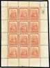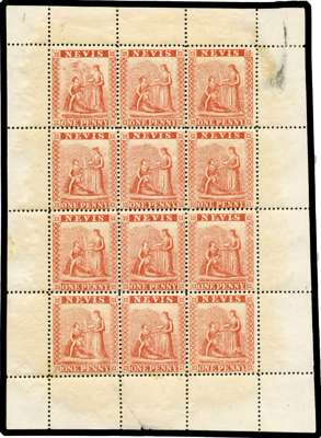 1871-8 1d pale red sheet of twelve, Pane ‘A’ with #1 major retouch above seated figure, #12 large flaw on dress. O.g. with adhesion on reverse of #2-3 and marginal faults, still a fine sheet. SG 15