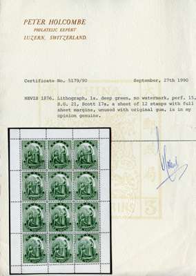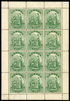 1871-8 1s deep green sheet of twelve showing position 9 crossed lines on hill corrected, large part or full o.g. Holcombe Certificate (1990), ex Freeland. SG 21, £1560