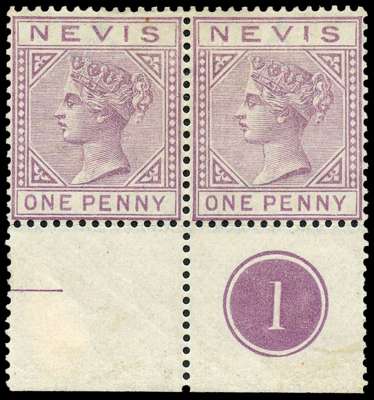 1882-90 1d lilac-mauve lower marginal pair, the right stamp (R5/10) with Plate plug and showing the damaged ‘I’ of NEVIS (see Borromeo & Freeland page 101), large part o.g. Ex Freeland. SG 26 var