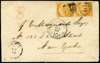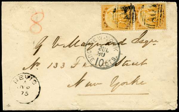 1875 cover from the Maynard correspondence bearing 4d (SG 11) white paper vertical pair, A09 cancels. Nevis CDS JY 9 at lower left and circular New York 10c Due datestamp of JUL 30 on front, the reverse with St Thomas transit of JY 19. Ex Charlton Henry and Hart, Borromeo & Freeland NP25