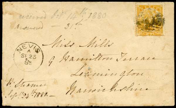1880 envelope (a little soiled) to Leamington, bearing 4d orange-yellow (SG 18) with smudged A09 cancel. Birmingham transit and Leamington arrival (OC 14) on reverse. Borromeo & Freeland NP61