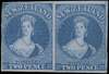 1855-58 2d blue on blue paper, no wmk, imperforate horizontal pair with close to very large margins (trace of adjoining stamp at right), large part o.g. with lovely colour. Minor corner bend at left, still an attractive and rare multiple. SG 5 cat £9000+