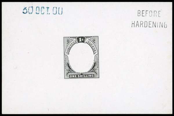 1900 1s frame die proof on glazed paper dated “30 OCT. 00” in blue and endorsed “BEFORE HARDENING” in black. Fine.