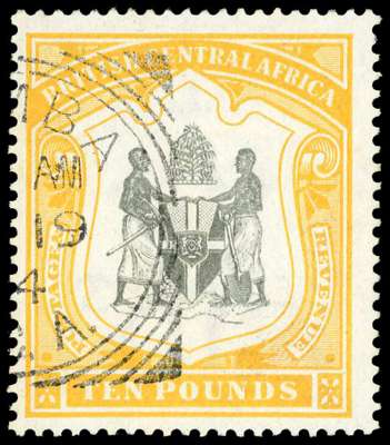 1897-1900 £10 black and yellow, exceptional colour, attractively cancelled by crisp part Zomba squared circle. Very fine and rare. SG 52, £3,500