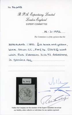 1897-1900 £10 black and yellow, wmk CC, attractively cancelled by complete 'FORT JOHNSTON' cds, dated 'DE 11 97'. Very fine and rare. BPA cert (1992). SG 52, £3,500