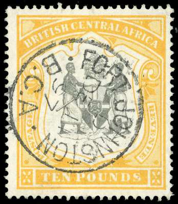 Nyasaland 1897 SG52 Used £10 black and yellow watermark CC