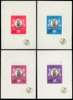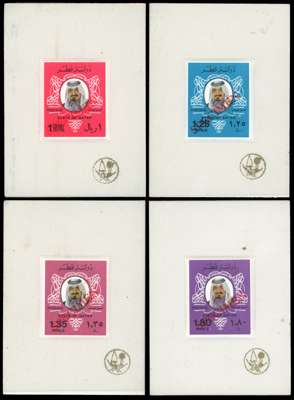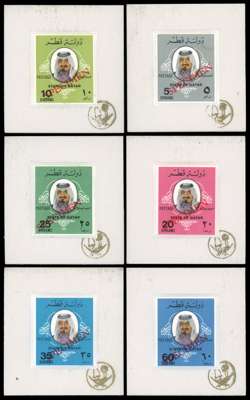 1979 5d to 10r (no 80d) Shaikh Khalifa imperforate values overprinted “SPECIMEN” sunk into individual presentation cards. Prepared for the 1979 Rio de Janeiro UPU Conference, only ten sets produced. Rare and most attractive. SG 658s/663s, 665s/670s