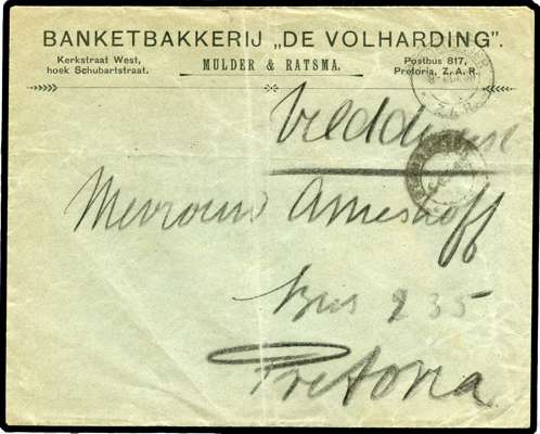 1899 Boer Soldier's mail, early mobilisation on Natal Border, cover addressed to Pretoria marked ‘Veld dienst' with very early Hoofdlager Z.A.R cds for 9 OCT, and arrival cds for 11 OC. The Boer HQ (Hoofdlager) at this time was centered around Zandspruit on the Transvaal Natal border. The Transvaalers under General Joubert totalled around 14,000 men, in addition 6000 Free Staters under Commandant Prinsloo assembled near Van Reenans Pass. Some creases to cover, otherwise fine. Soldier's mail from this early period is scarce.