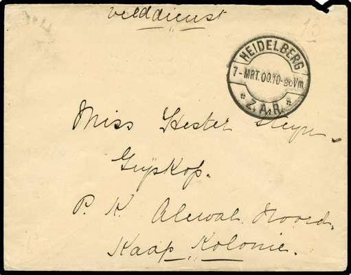 1900 stampless cover endorsed ‘Velddienst’ addressed to Aliwal North bearing Heidelberg cds for MR 07, backstamped by Pretoria transit cds and Bloefontein arrival for MR 10. Bloemfontein was occupied by the S.A.F.F. three days later on the 13th March and Aliwal North was occupied on the 12th March. This cover would have been delayed as the postal route was interrupted and received (if at all) at a much later date. Interesting and scarce cover.