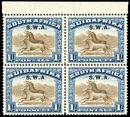 1927-30 1/- brown and deep blue perf 14 x 13½ (down) overprinted S.W.A., top marginal block of two pairs from R2/3-4 RP, with the left stamp showing no stop after 'A' and the right stamp with small stop after 'A'. o.g. with hinge remainder on the normal pair, the variety pair lightly hinged; fine and fresh for this rare positional multiple. SG 64b/ba, £1,700+