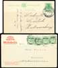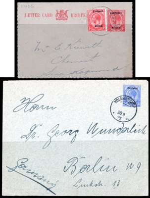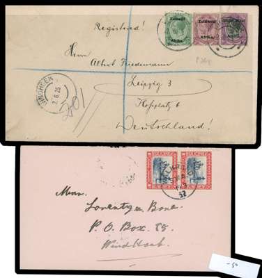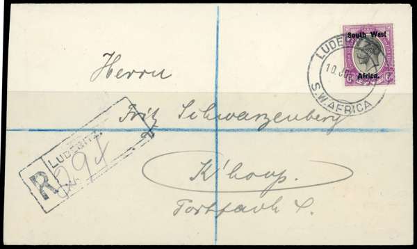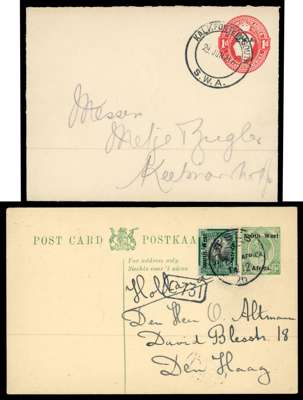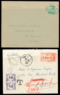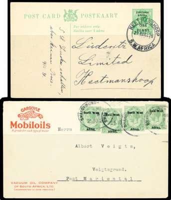1920s-1950s postal history collection, including 1933 Railway letter franked by 1d & 3d, tied by Goods Office Goederekantoor oval cancels for 1 AUG 1933, 1934 1½d postcard sent via air mail, bearing Air Mail Windhoek-Kimberley cds for 30.1.34, 1925 registered cover Windhoek, 1950 locally taxed cover used at Swakopmund, bearing Postage Due 1d, postal stationery with some uprated and O.H.M.S cover to Kimberley franked by 2d horizontal strip of three, generally fair to fine. (15)