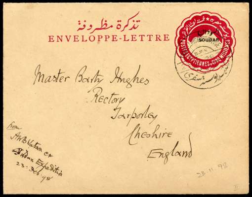 1898 Egypt optd ‘SOUDAN’ 5m postal stationery envelope addressed to England, with Travelling Post Office cds for 23.11.98, endorsed at lower left as from the ‘’Sudan Expedition 23 Feb 98" by Church of England Padre A.W.B. Watson, attractive and scarce.