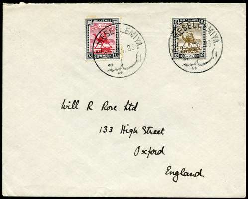 1936 envelope addressed to Oxford franked by 5m olive-brown & black and 10m carmine & black, tied by El Mesellemiya cds of 22 DEC 36, backstamped by Shellal Halfa d/s for 25 DEC, peripheral tones to 10m adhesive, otherwise fine, a neat cover with scarcer postmarks.