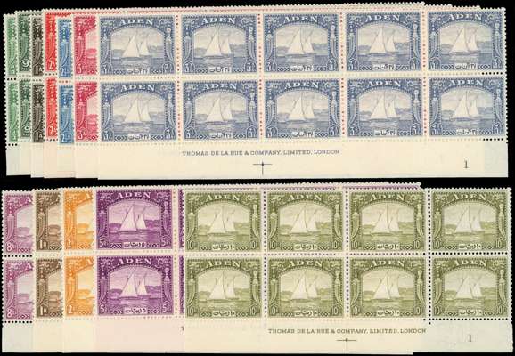 1937 "Dhow" set of 12 to 10r, matching lower marginal blocks of 10 (5x2 - ½a to 8a) or 8 (4x2) with FULL IMPRINT AND PLATE NUMBER "1", brilliant o.g. (except one 3a with toning on reverse). An remarkable and highly attractive set of multiples, the ideal form for this iconic set and extremely rare thus with no comparable sets known to us. Splendid ! SG 1-12 £9600+
