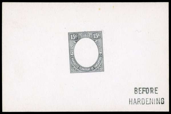 1927-31 15c De La Rue frame die proof in black on glazed card, undated, endorsed “BEFORE HARDENING” in black.