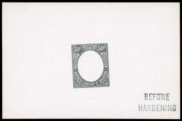 1927-31 50c De La Rue frame die proof in black on glazed card, undated, endorsed “BEFORE HARDENING” in black.