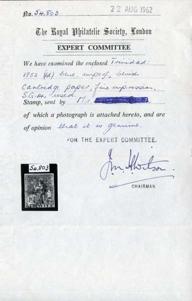 1852-60 (1d) blue, bluish cartridge paper, fine impression, close to good margins, cancelled by black barred numeral. RPS Certificate (1962). SG 14, £2,500